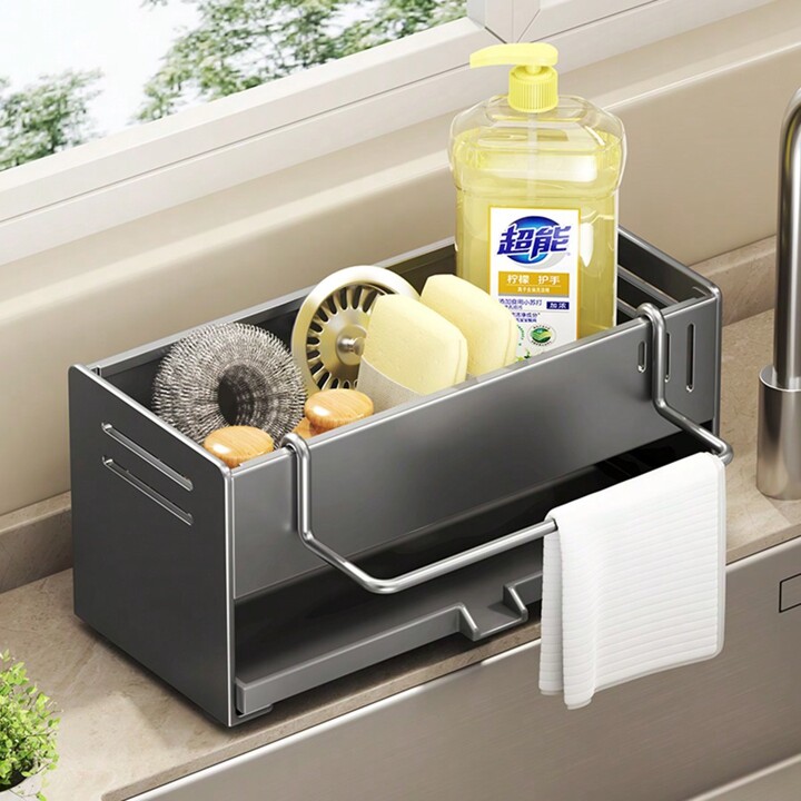 Βάση οργάνωσης νεροχύτη κουζίνας με θήκη για σαπούνι/σφουγγάρι και αξεσουάρ, με μεταλλική κρεμάστρα πανιού inox και βάση με ειδική δίοδο για την αποβολή του νερού στον νεροχύτη σας.