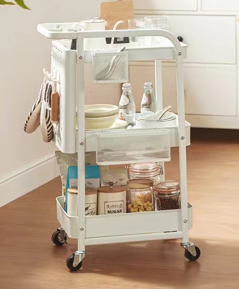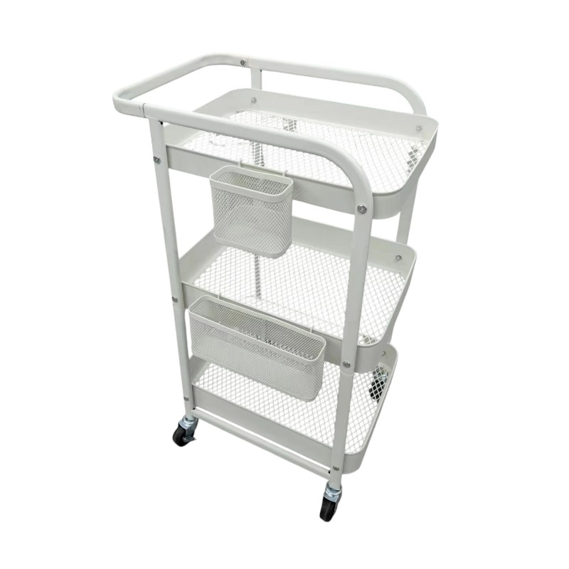 Μεταλλική, τριώροφη ραφιέρα-μανάβης, τρόλεϊ με λαβή για εύκολη μετακίνηση.