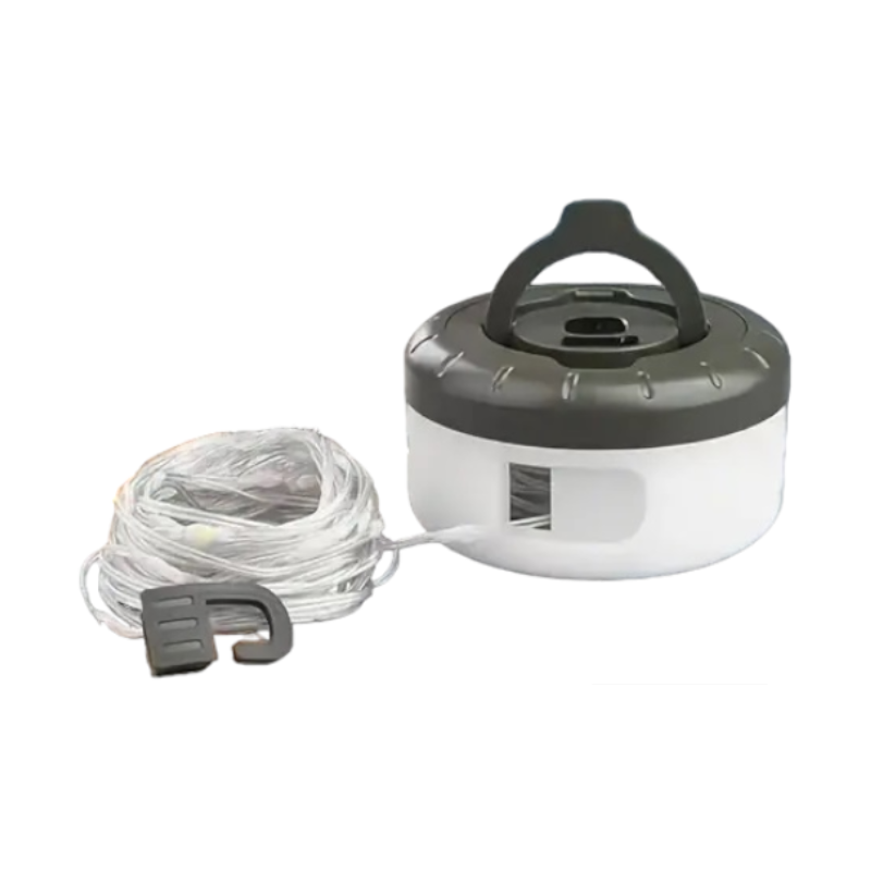 Επαναφορτιζόμενη λάμπα LED σετ με γιρλάντα φωτισμού που συνδέεται και τροφοδοτείται από την λάμπα, με πολύχρωμο φωτισμό RGB. Ιδανική για διακόσμηση εξωτερικών χώρων ή πρακτική χρήση στο κάμπινγκ και τις υπαίθριες δραστηριότητες σας. Η λάμπα διαθέτει αυτόνομο φωτισμό και η γιρλάντα μαζεύεται σε ρολό εντός της λάμπας προσδίδοντας έξτρα εφέ.