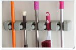 Επιτοίχια πλαστική βάση οργάνωσης για σκούπες και παντός τύπου εργαλεία με κοντάρι, με 5 θέσεις με προσαρμόσιμο μέγεθος και σταθερή στήριξη.