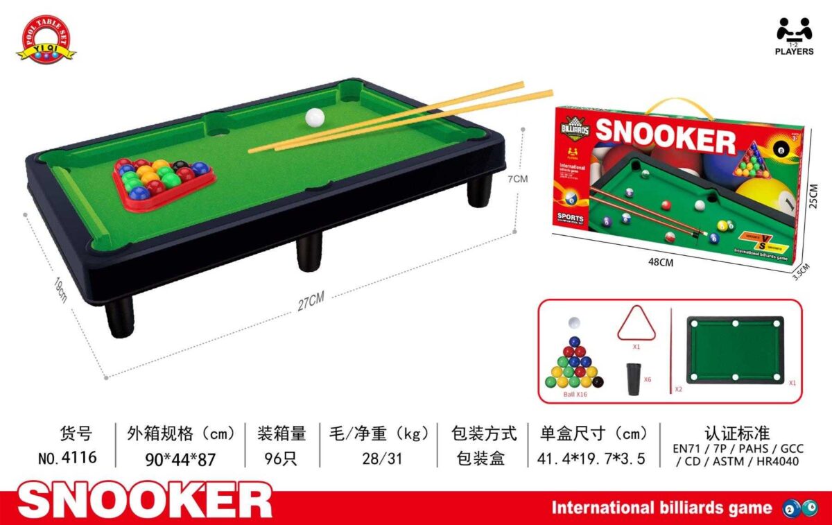 Επιτραπέζιο μπιλιάρδο mini, πλαστικό, με τσόχα, σε υπέροχο ρεαλιστικό σχεδιασμό, με 2 στέκες και πλήρες σετ αξεσουάρ, για τους μικρούς λάτρεις του αθλήματος.