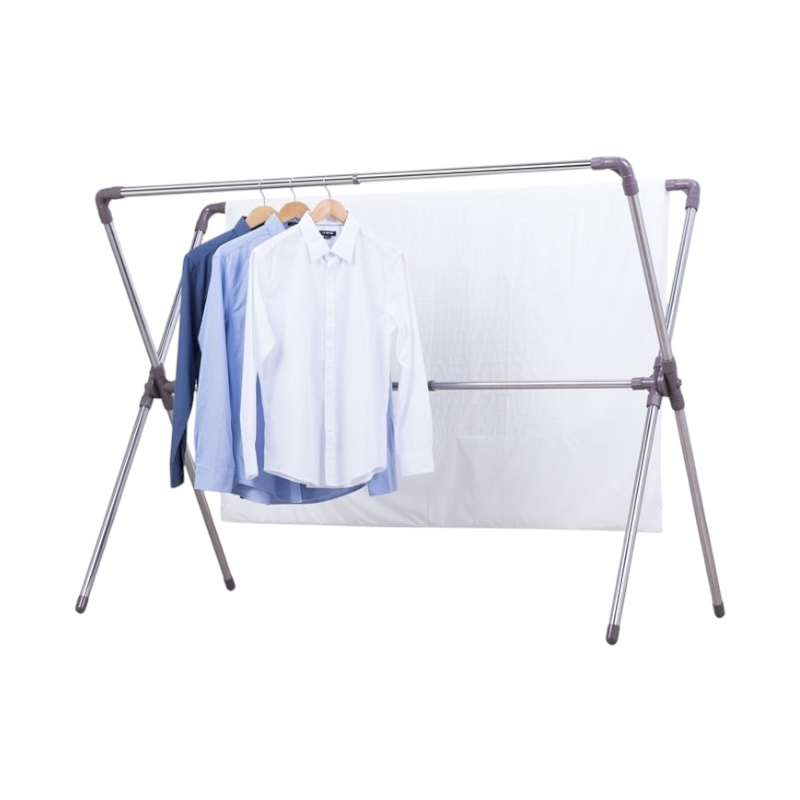 Πτυσσόμενη κρεμάστρα δαπέδου διπλή και απλώστρα ρούχων πολλαπλών χρήσεων. Μεταλλικός σκελετός. Ρυθμιζόμενο μήκος βέργας. Διαστάσεις: 118-200 x 78 x 127 cm.