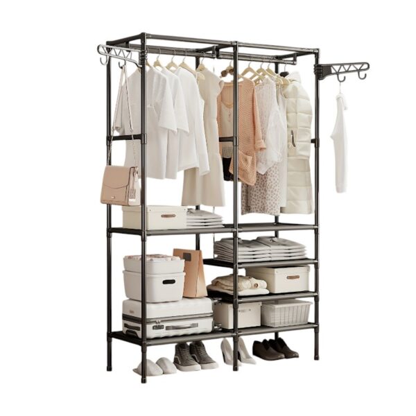 Κρεμάστρα δαπέδου με μεταλλικό σκελετό, με υφασμάτινα ράφια παπουτσιών και αξεσουάρ και έξτρα πτυσσόμενο γάντζο κρεμάσματος στα πλαϊνά,