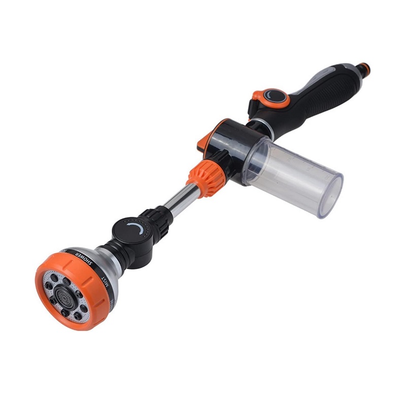 Πιστόλι ποτίσματος για λάστιχο με ενσωματωμένο δοχείο σαπουνιού 100ml. Διαθέτει εργονομική λαβή, 8 διαφορετικές ρυθμίσεις ψεκασμού, ρυθμιζόμενη πίεση και κεφαλή με ρυθμιζόμενη κλίση. Διαστάσεις: 47x15cm. Απόσταση ψεκασμού: έως 10m.