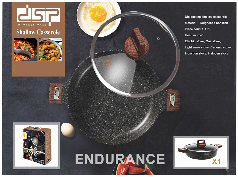 Ρηχή κατσαρόλα υψηλής ποιότητας κατασκευής από την DSP, με ισχυρή αντικολλητική επίστρωση και γυάλινο καπάκι.