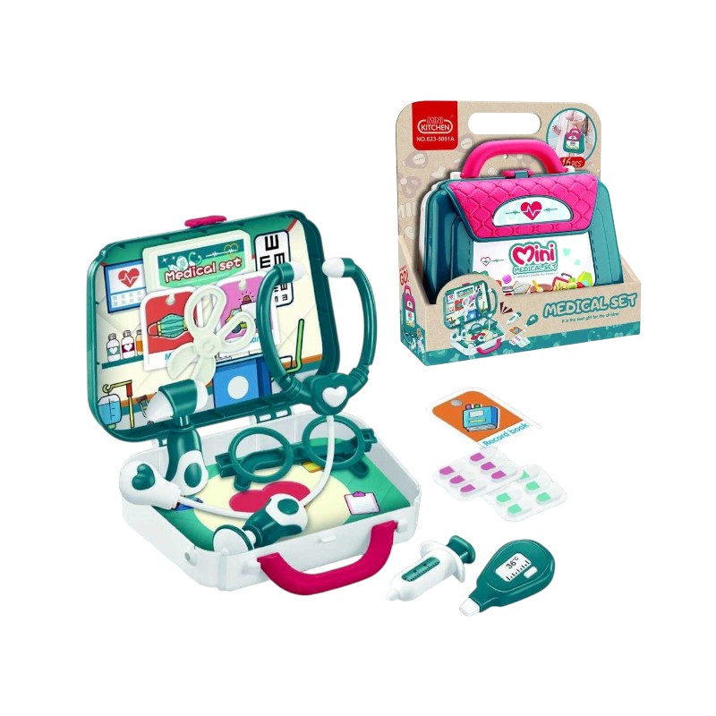 Παιχνίδι σετ ιατρικής σε υπέροχο σχεδιασμό με πολλά αξεσουάρ, σε πανέμορφο, πρακτικό βαλιτσάκι μεταφοράς.