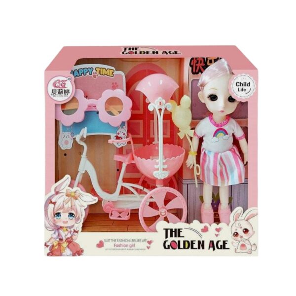 Σετ κούκλα σε vintage στυλ, με σετ αξεσουάρ κουζίνας και καροτσάκι μωρού, σε υπέροχο πολύχρωμο σχεδιασμό!