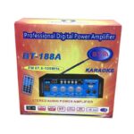 Bluetooth ενισχυτής ήχου με λειτουργία Karaoke BT-188A, με τηλεχειριστήριο, επεκτάσιμη κεραία και λειτουργία ραδιοφώνου FM. Διαθέτει είσοδο USB και SD και έλεγχο έντασης ήχου, μπάσων και πρίμων για να ακούτε ευχάριστα την αγαπημένη σας μουσική.