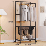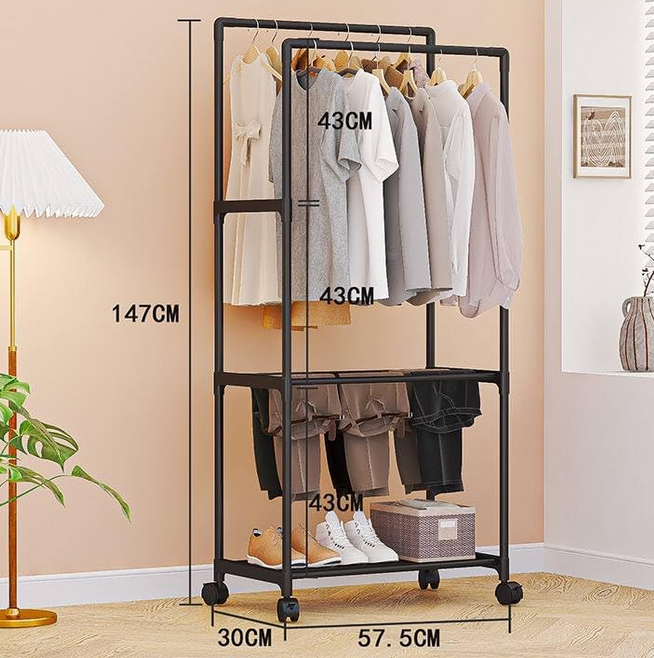 Τροχήλατη κρεμάστρα δαπέδου διπλή με 2 ράφια πολλαπλών χρήσεων, ιδανική ως έπιπλο εισόδου ή για την οργάνωση των ρούχων στο δωμάτιό σας .