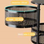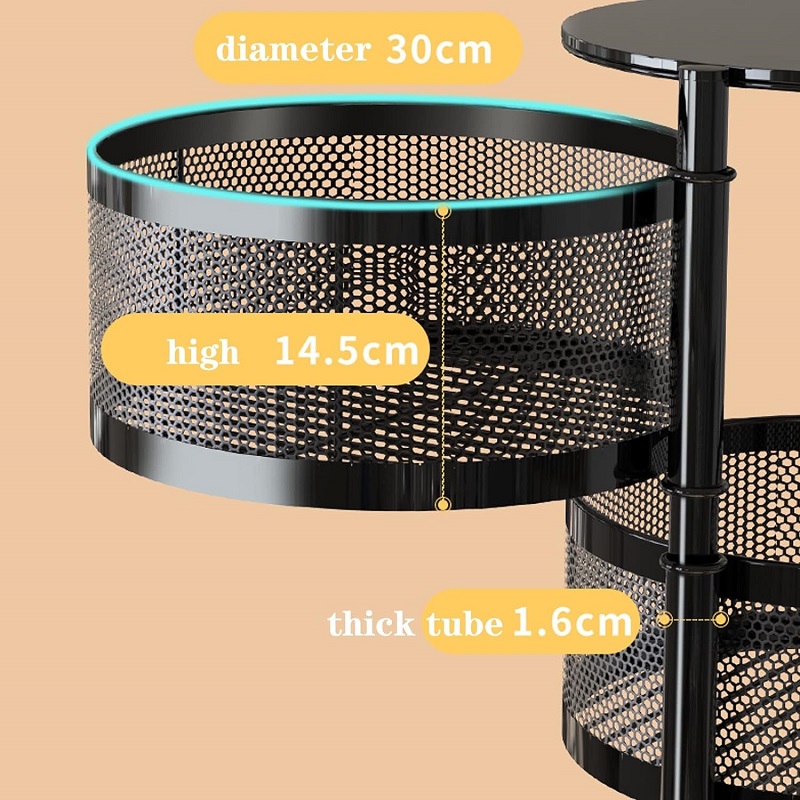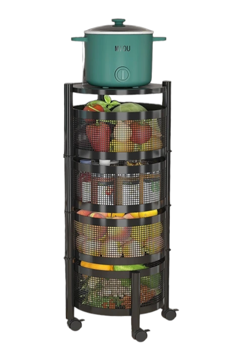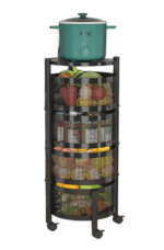 Μεταλλική ραφιέρα με 4 στρογγυλά ράφια και 4 ρόδες για εύκολη μετακίνηση. Εργονομικός σχεδιασμός με πτυσσόμενα ράφια που ανοίγουν στο πλάι για εξοικονόμηση χώρου και εύκολη καθημερινή χρήση, με ράφια μεγάλης χωρητικότητας και περιστρεφόμενες ρόδες 360° με στοπ ασφαλείας. Ιδανική για την κουζίνα, την αποθήκη, το μπαλκόνι σας ή οποιοδήποτε χώρο επιθυμείτε. Διαστάσεις: Ύψος: 75cm – Διάμετρος ραφιού: 30cm – Βάθος ραφιού: 14.5cm.
