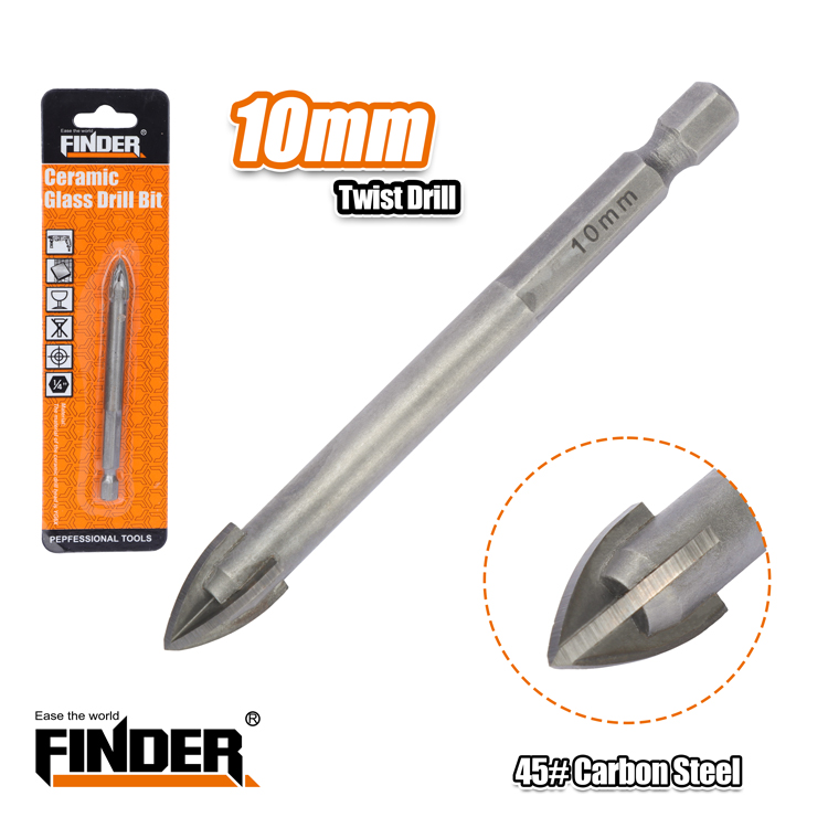 Τρυπάνι τετράκοπο γυαλιού και πλακιδίων της Finder, κατασκευασμένο από ατσάλι #45 Carbon Steel. Μέγεθος: 10mm.